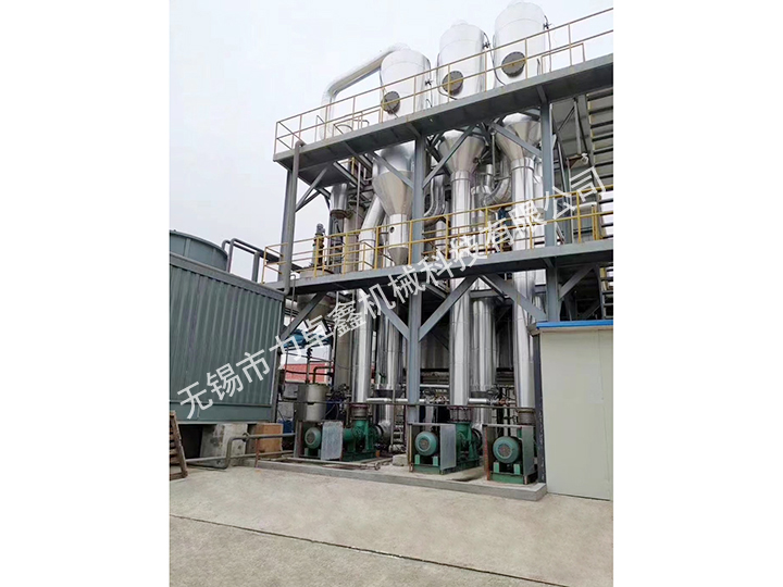 工作原理:四效降膜蒸發(fā)器需濃縮的料液由泵送入加熱管頂部,沿著加熱管內(nèi)壁形成液膜向下流動(dòng)。在這個(gè)過(guò)程中,由于管外的加熱,管內(nèi)液膜開(kāi)始沸騰并部分蒸發(fā)